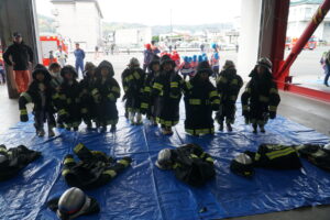消防車両で写真を撮ったり、消防車に乗のったり、防護服を着たり煙体験をしたりと様々な体験を取り組んでいました。