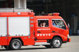 消防車両乗車では、乗る前から目をキラキラ輝かせている子ども達。消防車に乗って一周しました。無線で「消防車が出発します」と言ったり楽しそうな様子の子ども達でした。