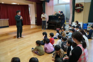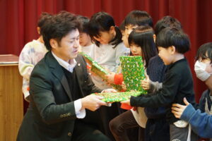 寄贈された絵本がクリスマスを感じさせる素敵な包みに包まれていたこともあり、ワクワクした笑顔が広がっていました。代表の子どもが大切そうに受け取る姿も印象的でした。