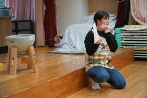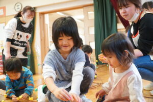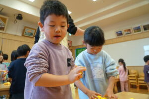 もちつきの後は、色を付けた紙粘土を使ったミズキ団子作り。保育者と一緒に「こねこね」と楽しみながら、色が混ざっていく様子や柔らかな感触を味わいました。