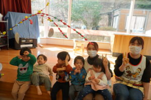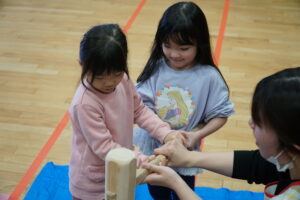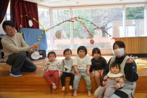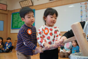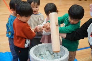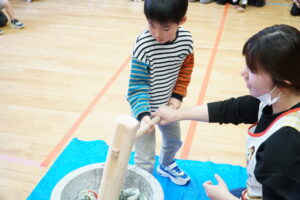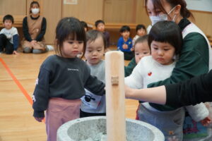 ホールには「よいしょ!よいしょ!」の元気な掛け声と、きねでおもちをつく音が響きわたり、お友だちがもちつきを行う姿を目を輝かせながらその様子を見守っていました。毎年おなじみの濡れタオルを使ったもちつきは、園ならではの伝統行事です。