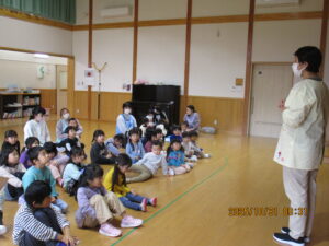 「おいしいとびらをとんとんとん」という紙芝居で、いろいろな形の食べ物が出てきて、小さいお友だちも一緒に楽しめました。