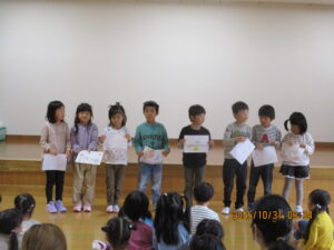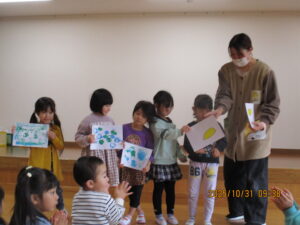 きりん組のお友達は自分たちで掘ったさつまいもを使ったスタンプで作った絵を発表しました。