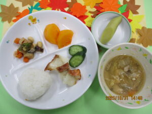 収穫祭のメニューはシンプルな白いおにぎりに合う献立になっています。