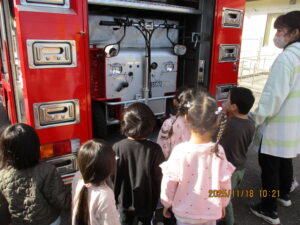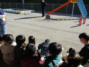 子ども達は消防士さんと「子どもだけで火遊びをしない。小学校になっても中学校になってもしない」とお約束しました。