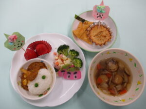 節分と言ったら豆…節分のお誕生会には何が食べたいか?らいおん組さんに聞いていたのですが「鬼のカレーでしょう」という意見が多かったので、2月の誕生会はカレーになりました。大豆を入れて「鬼は外カレー」にしました。カレーは大人気メニューなので残さず全部食べていました。