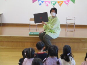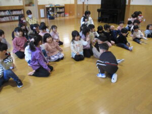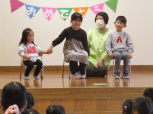 お名前と何歳になったかを発表して、お友達からの質問には緊張しながらも元気に答えていました。