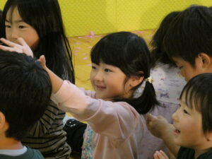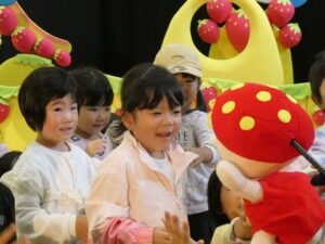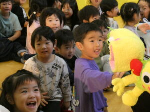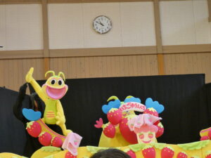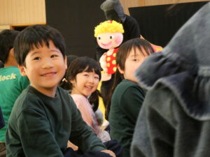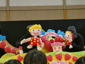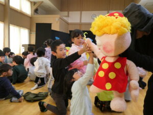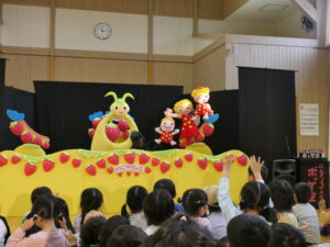 子ども達が座っている所にも劇中の人形たちが来てくれて、触ったりお話をしたりと喜んでいる姿が見られました😊