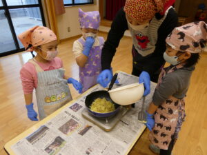 バターと砂糖を熱し、クンクンとにおいをかいで「いいにおい~!」とワクワクの子どもたち…