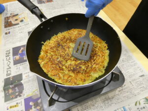やけどしないように気を付けながら、慎重にさつまいもをぎゅっぎゅっと押して美味しそうな焦げ目をつけていました!