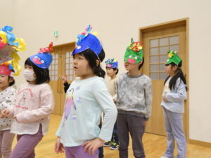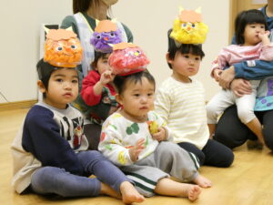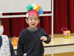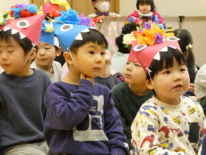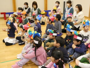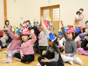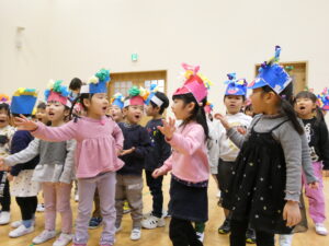 最後は元気いっぱい「豆まき」「鬼のパンツ」のお歌を歌います♪身振り手振りも付けながら大きな声で歌う子ども達でした✨