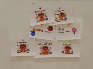 たくさんの鬼が登場し子ども達も自分の中にいる鬼について考えている表情でした😊また、節分に食べる豆や恵方巻についても知り、クイズにも自信たっぷりで正解する子ども達です✨