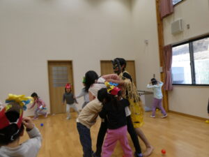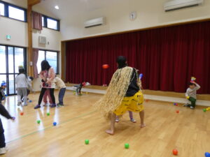ホールに鬼が登場し、子ども達も驚きの表情!😲「怖いー!」と泣きながら逃げる子ども達でしたが、ボールが出てくると鬼を退治しようと勇敢に戦う子ども達!大好きな先生が鬼に連れて行かれそうになると必死に助けようと頑張るかっこいい子ども達でした✨ひよこ組つくし組のお友だちも涙を流しながら鬼さんにボールを投げて頑張りましたよ!✨