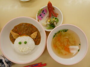 たくさん涙を流しながら頑張った豆まき会。終わって安心すると「お腹すいたなぁ~!」と笑顔が戻ってきた子ども達✨可愛い鬼さんのカレーを美味しそうに食べていました😋