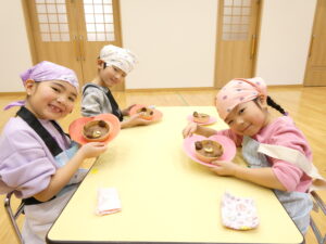 ボウルに顔を近づけ、「いいにおい!」とにっこりの子どもたちです😊